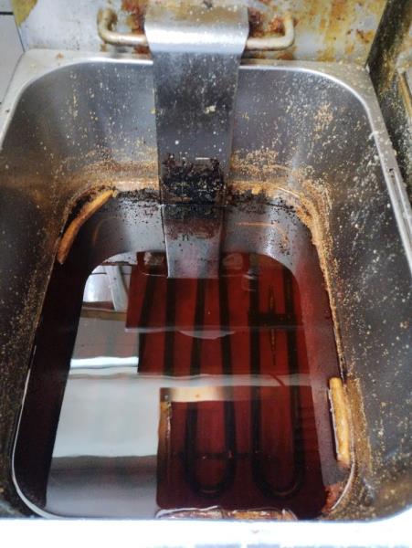 Používaný fritovací olej vykazoval známky tepelného rozkladu - nepříjemný zápach typický pro přepálený olej, hnědá barva, přítomnost přepálených částeček dříve smažených potravin, vysoký obsah polárních látek, docházelo k tvorbě kouře modrošedé barvy.
