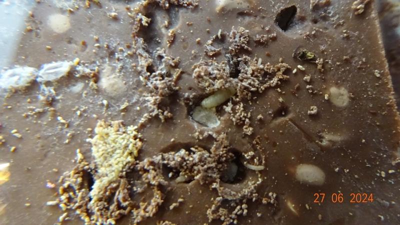 Na obalu potraviny i uvnitř balení byli zjištěni škůdci a stopy po jejich působení (pavučinky).