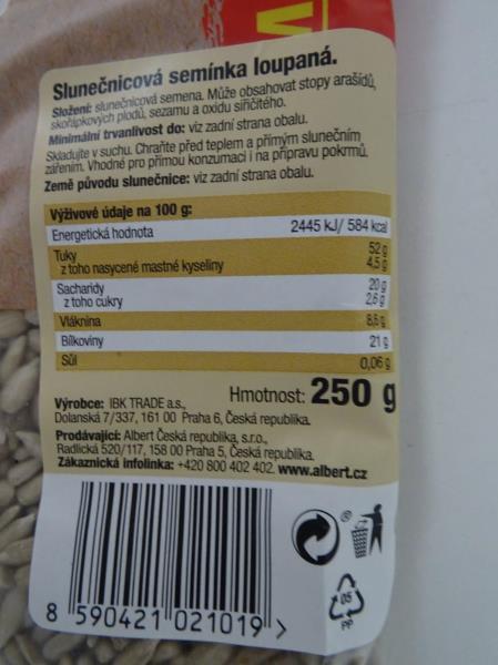 Chuť a vůně slunečnicových semínek byly žluklé. Potravina se nepovažuje za bezpečnou, pokud jeví známky kažení.