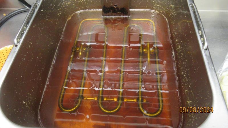 Vzorek oleje byl odebrán z fritézy. Olej vykazoval známky tepelného rozkladu - měl hnědou barvu, zápach typický pro přepálený olej, chuť byla nahořklá až palčivá. V oleji byly patrné zuhelnatělé zbytky.