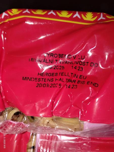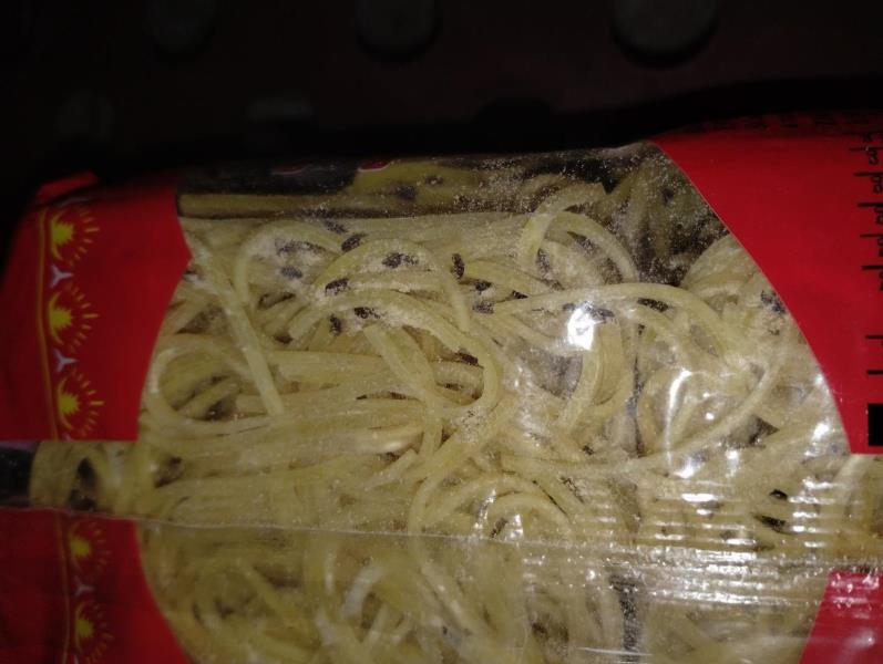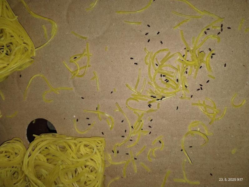 Uvnitř výrobku pod obalem byl zjištěn výskyt mrtvých hmyzích škůdců a stop po jejich činnosti (pavučinky, poškozené nudle). Potravina se nepovažuje za bezpečnou, pokud jeví známky kažení.