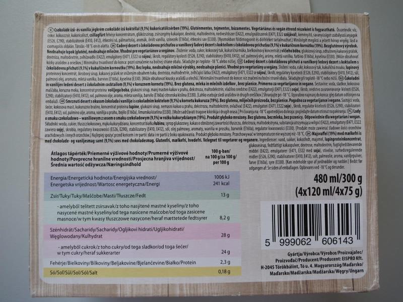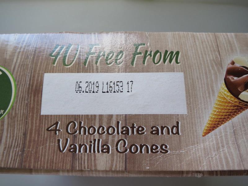 4U Free From 4 Chocolate and Vanilla Cones. Ledový dezert s čokoládovou příchutí a vanilkový ledový dezert s koktailem s čokoládovou příchutí (9,1%), v kukuřičném kornoutku (19%).