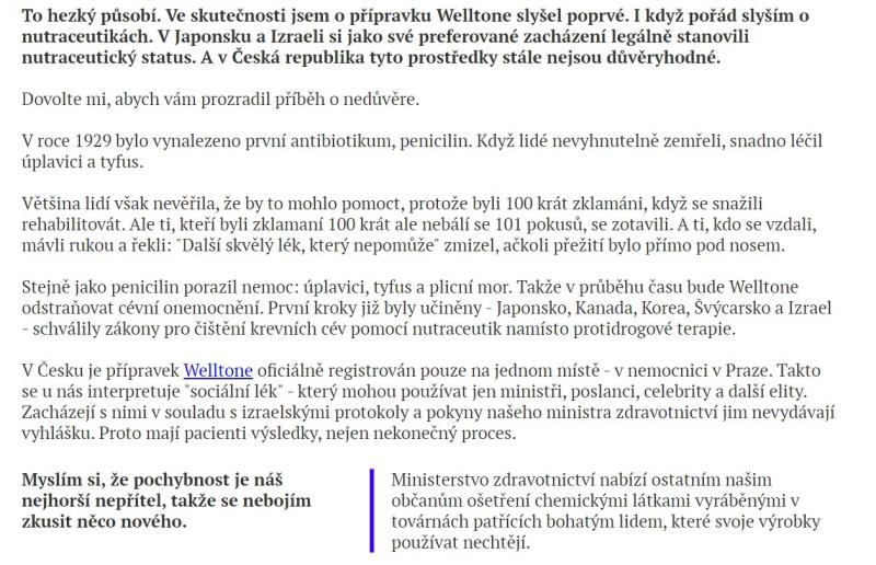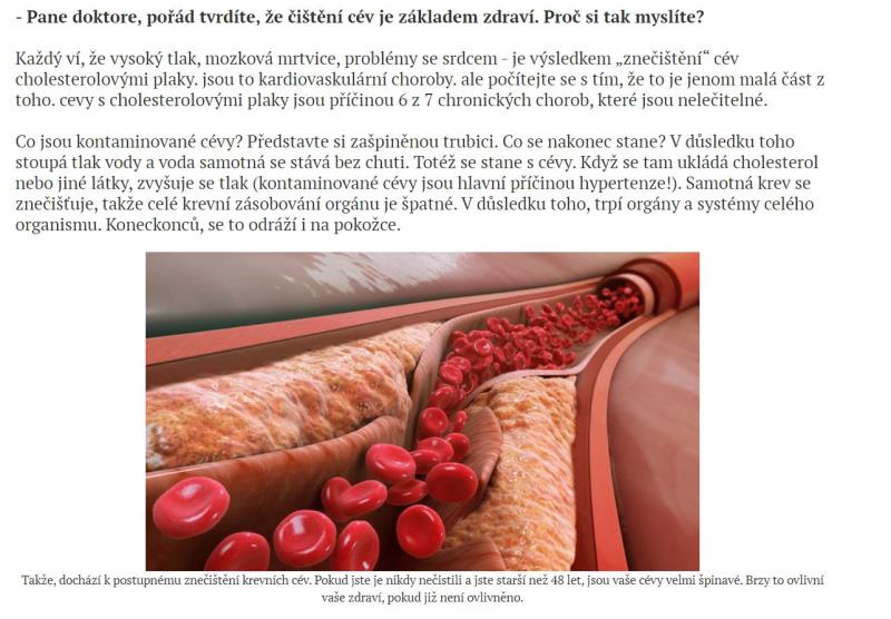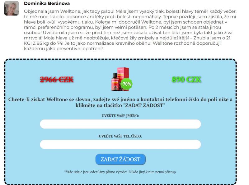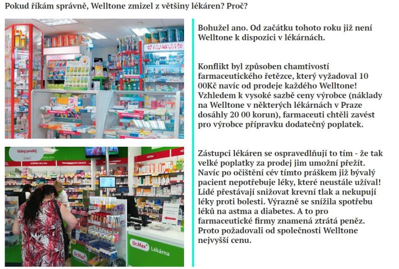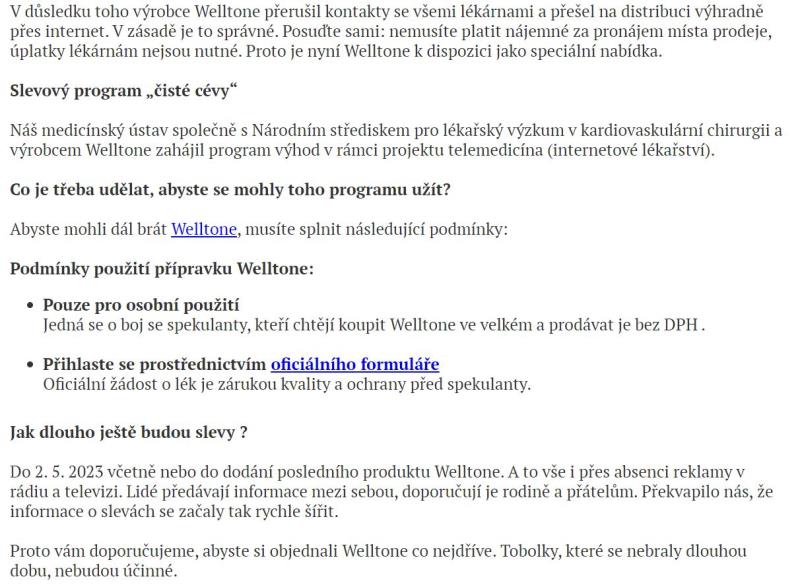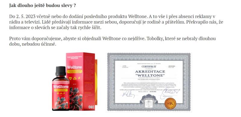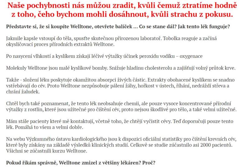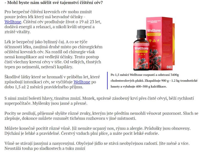 Webové stránky jsou v českém jazyce. Nabízený produkt je možné koupit za české koruny. Je zde nabízen výrobek Welltone, který údajně umožní vyčistit cévy od cholesterolu.
