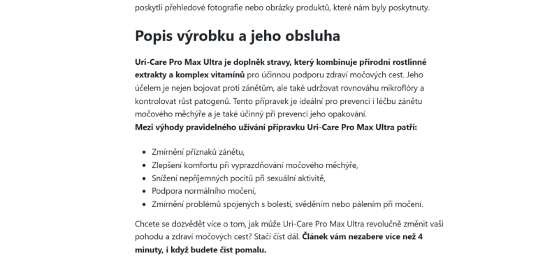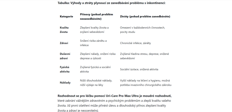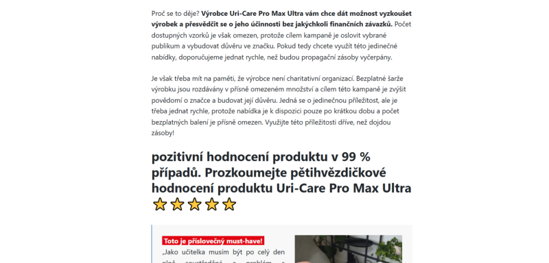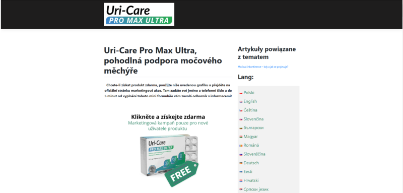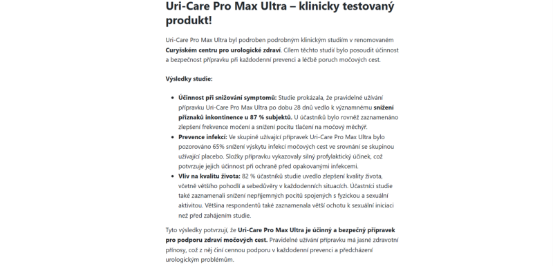 The website is in the Czech language. It is an advertising website presenting the product Uri-Care PRO MAX ULTRA, which is claimed to help address issues related to incontinence.
