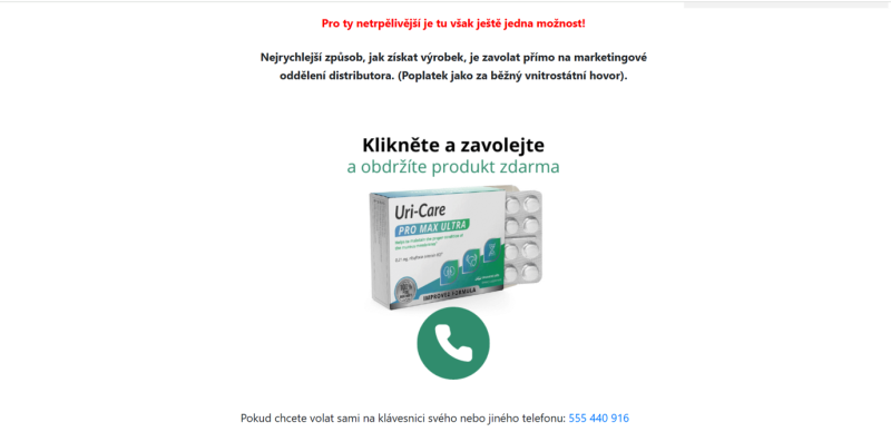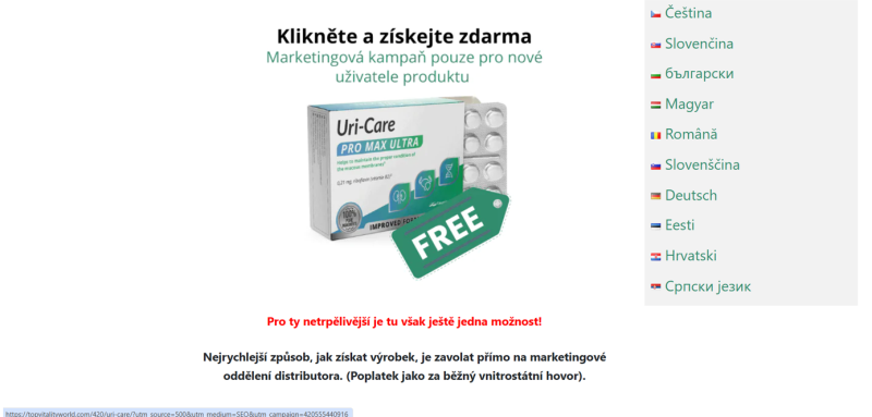 5) Clicking on the graphic representation of the food product with the inscription “Click and get for free” redirects to the website https://topvitalityworld.com/420/uri-care/?utm_source=500&utm_medium=SEO&utm_campaign=420555440916, where an order form is available. Customers enter their name and phone number and are then contacted via phone to confirm the order and arrange delivery details. For a faster process, they can call the phone number listed on https://uricarepromaxultra.com/cs/ directly.