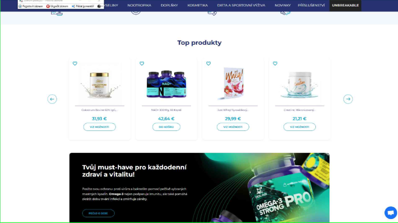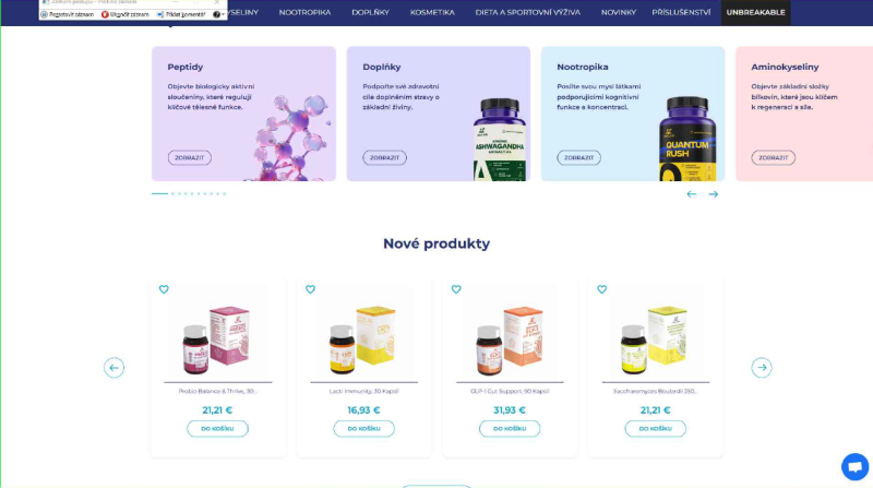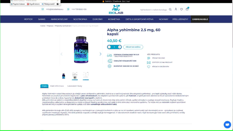 Stránky jsou v českém jazyce, místy ale dochází k mísení českého a polského a také českého a italského jazyka. Na několika místech se také nachází gramatické chyby. Veškeré ceny u produktů jsou uvedeny v eurech. Zboží po vložení do košíku a vyplnění základních fakturačních údajů lze doručit do České republiky. Na webové stránce se nachází v horní části hlavní strany několik záložek (Peptidy“, „SARMS“, „Aminokyseliny“, „Nootropika“, „Doplňky“, „Kosmetika“, „Dieta a sportovní výživa“, „Novinky“, „Příslušenství“ a „Unbreakable“). Většina záložek obsahuje rozbalovací lištu. Na webové stránce je nabízeno velké množství produktů, které jsou určeny na široké spektrum problémů (např. produkt Nepokalánek 500 mg je určen na hormonální problémy - stabilizace hladin estrogenu, prolaktinu a progesteronu, dále má pomáhat při PCOS (syndrom polycystických ovárií), či mít například ochranný a protirakovinný účinek nebo například produkt Saw palmetto 500 mg, který má ochranný účinek na srdce, protizánětlivé, antibakteriální či antiandrogenní účinky a zabraňuje androgenní alopecii).
