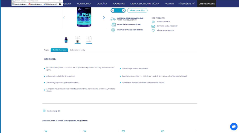5) Na webové stránce chybí povinné informace, které je třeba poskytovat u doplňků stravy dle nařízení (EU) č. 1169/2011, o poskytování informací o potravinách spotřebitelům, a dle vyhlášky č. 58/2018 sb. o doplňcích stravy (např. u produktu Inferno Fat Blaze (SLU-PP-332) 5300 mcg a u produktu Kanna 25 mg, 60 kapslí chybí označení „doplněk stravy“, varování že doplňky stravy neslouží jako náhrada pestré stravy, informace o čistém množství produktu aj.)