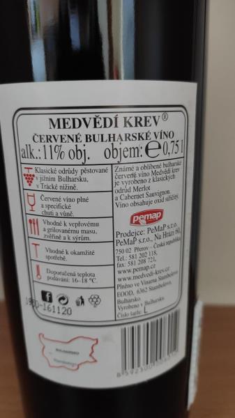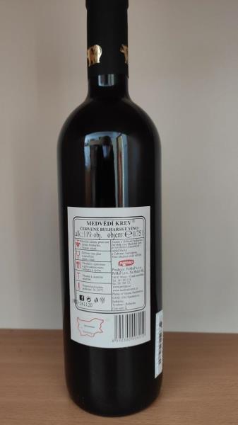 Medvědí krev, červené bulharské víno, alk. 11 % obj., č.š. L 1950-161120