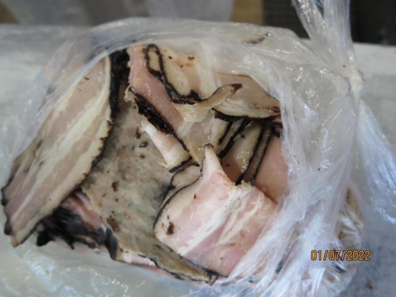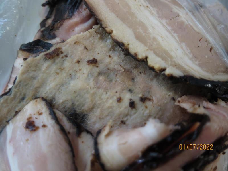 Potravina zapáchala po kažení, povrch byl lepkavý a byla na něm zjištěna plíseň zelené barvy. Potravina se nepovažuje za bezpečnou, pokud jeví známky kažení.