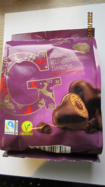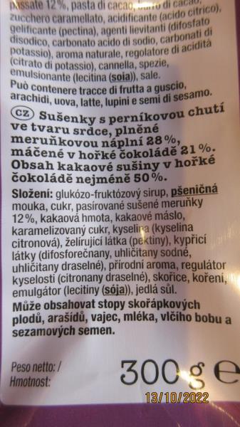 Sušenky s perníkovou chutí ve tvaru srdce, plněné meruňkovou náplní 28%, máčené v hořké čokoládě 21%