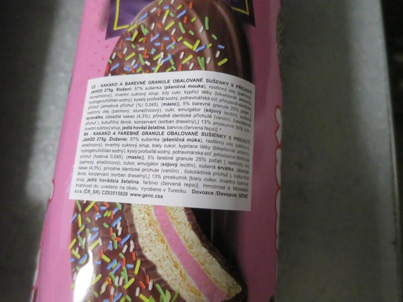 Laboratorní analýza prokázala přítomnost syntetických barviv tartrazin (E102), brilantní modř FCF (E133) a košenilová červeň (ponceau 4R, E124), která nebyla uvedena na obalu.