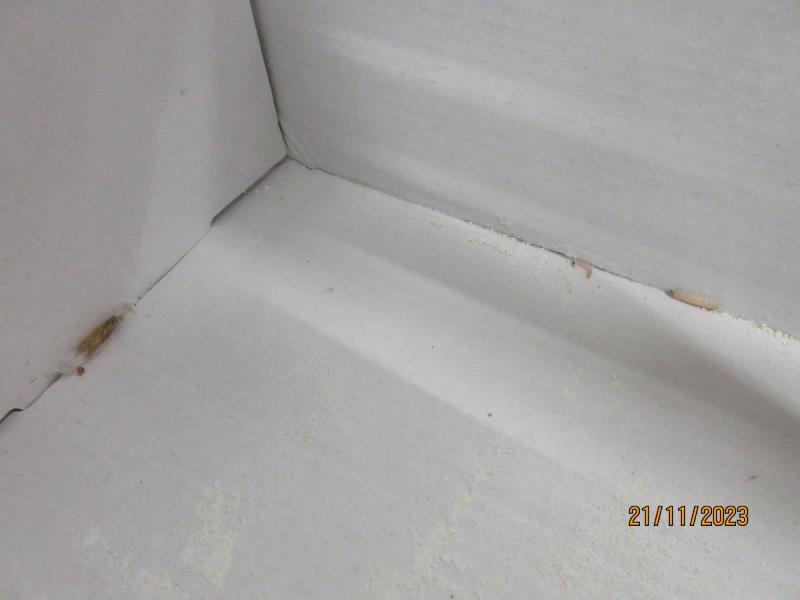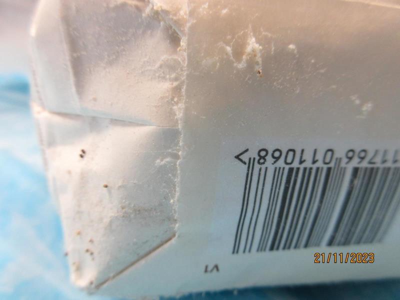 Na obale potraviny se vyskytovali živí škůdci a stopy po jejich činnosti. Výskyt škůdců byl zjištěn na primárních obalech potraviny a uvnitř obalů pro skupinové (přepravní) balení.