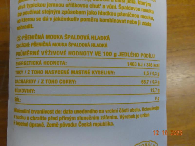 Dle informací na obalu se mělo jednat o špaldovou mouku, tedy mouku z pšenice špaldy (Triticum spelta). Výrobek však kromě pšenice špaldy obsahoval také pšenici setou (Triticum aestivum), která nebyla uvedena ve složení.