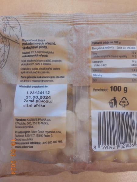 Vůně a chuť ořechů byly cizí, netypické a žluklé. Potravina se nepovažuje za bezpečnou, pokud jeví známky kažení.