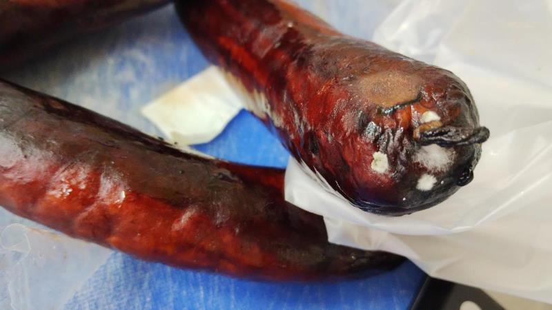 Potravina zapáchala po kažení. Na povrchu se vyskytovaly kolonie plísní viditelné pouhým okem.