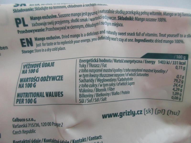 Na obalu ve složení bylo uvedeno, že se jedná o "mango sušené 100%". Laboratorní analýzou byl však prokázán přídavek cukru. Obsah cukru ve výrobku byl podstatně vyšší, než bylo uvedeno na obalu. Potravina nesplňovala legislativní požadavek na sušené ovoce, neboť sušeným ovocem se rozumí ovoce konzervované sušením bez použití přírodních sladidel.