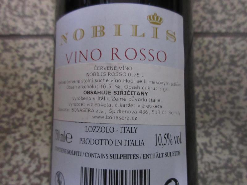NOBILIS VINO ROSSO ČERVENÉ VÍNO, OBSAH ALKOHOLU: 10,5%, VYROBENO V ITÁLII. ZEMĚ PŮVODU ITÁLIE