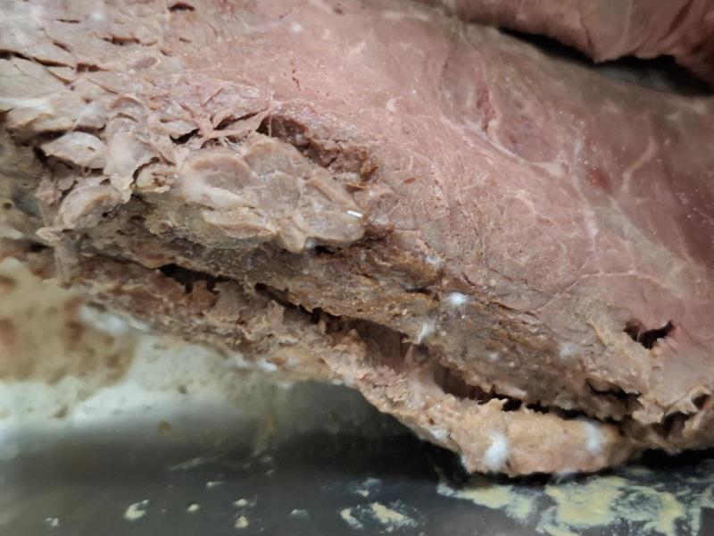 Na povrchu potraviny se vyskytovala plíseň bílé barvy. Potravina se nepovažuje za bezpečnou, pokud jeví známky kažení.