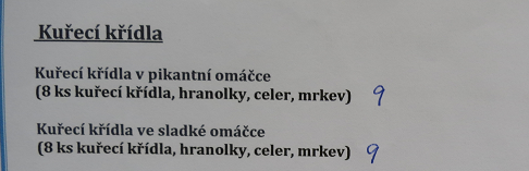 Kuřecí křídla ve sladké omáčce (8 ks kuřecí křídla, hranolky, celer, mrkev)