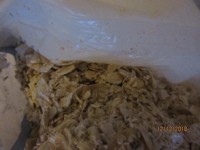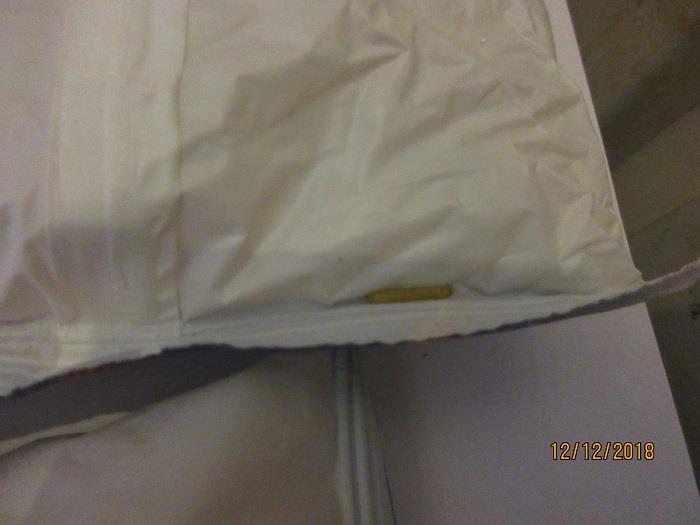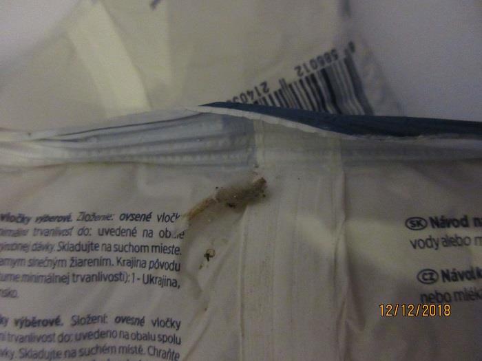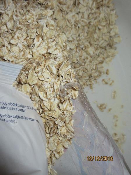 Uvnitř výrobku byl zjištěn výskyt škůdců a stop po jejich činnosti. Obaly byly znečištěny a poškozeny činností škůdců - pavučinky, dírky.
