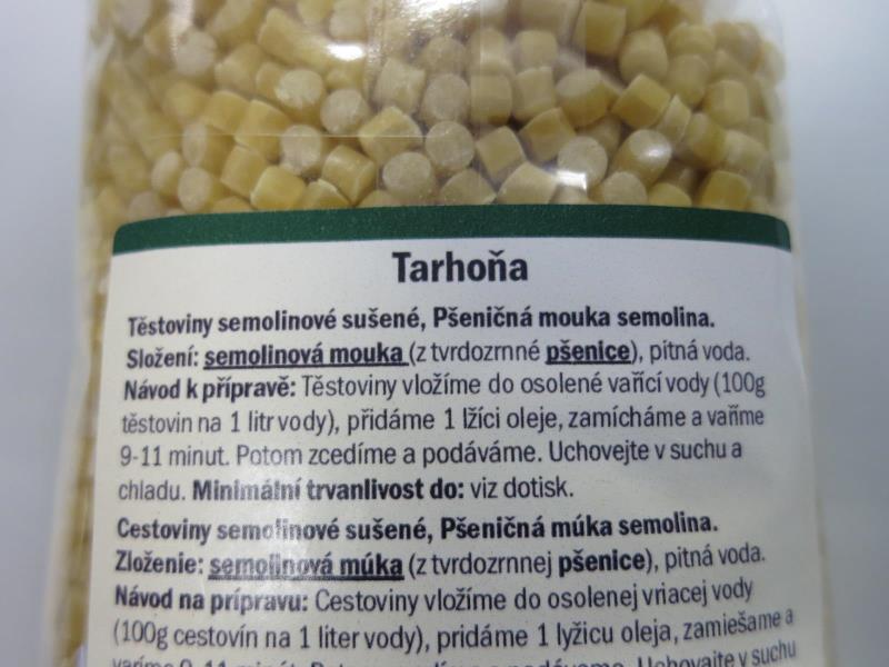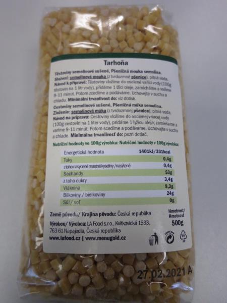 MENU GOLD Těstoviny TARHOŇA, Těstoviny semolinové sušené 500 g.