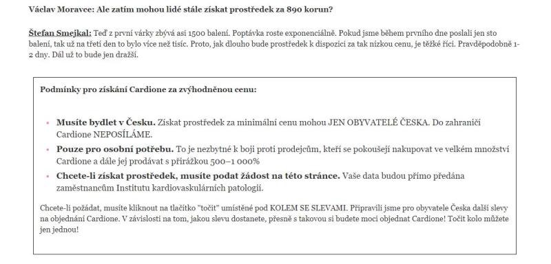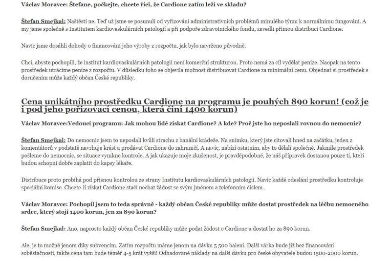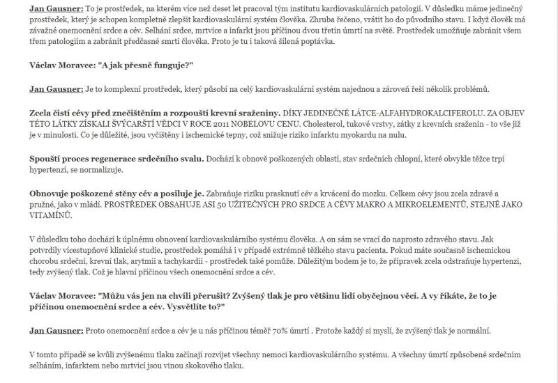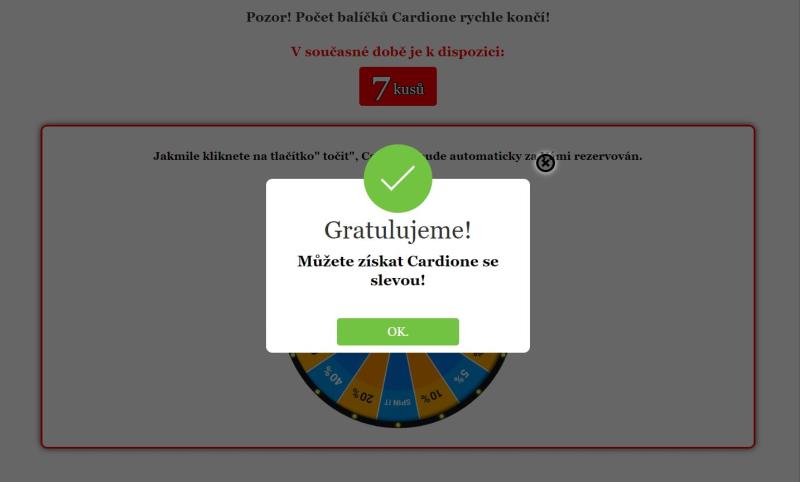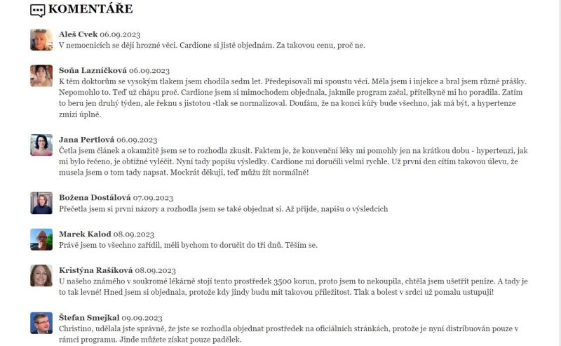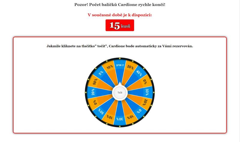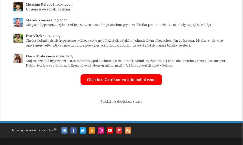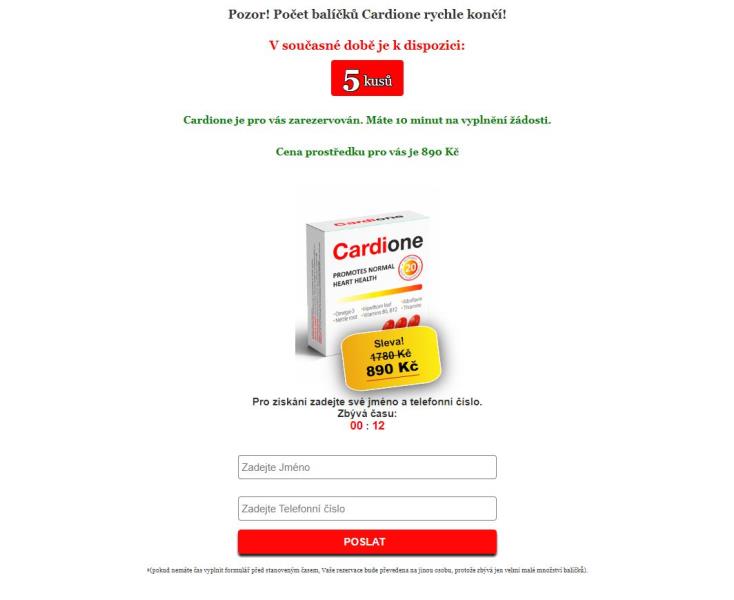 The website is in Czech language. The product is offered for Czech crowns. The website offers the food supplement Cardione, which supposedly stabilizes blood pressure, cleans blood vessels, dissolves blood clots, restores damaged vessels and strengthens them.