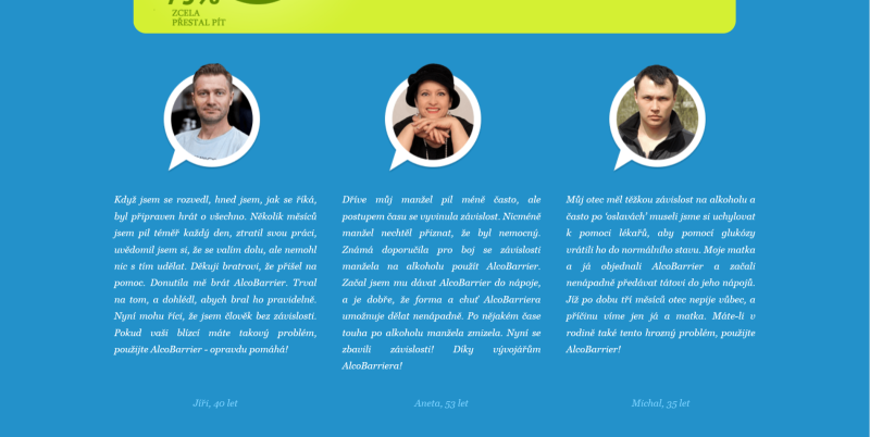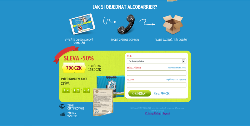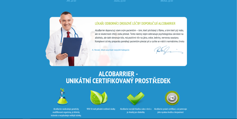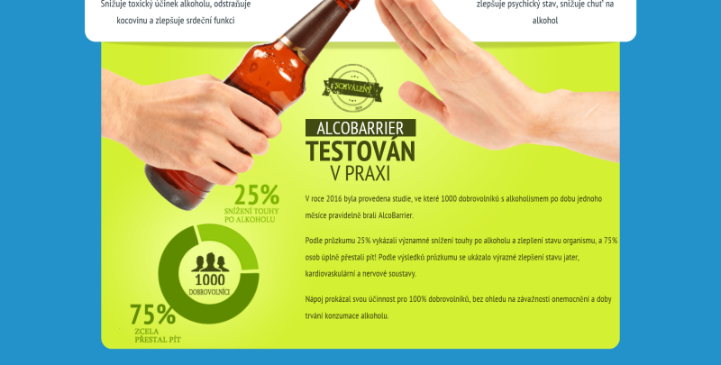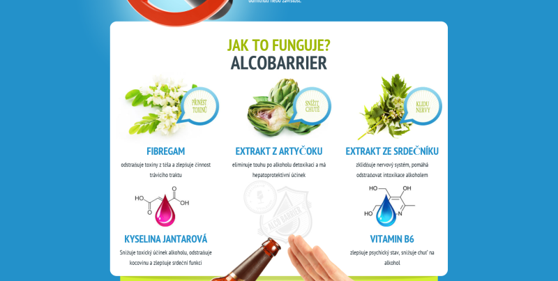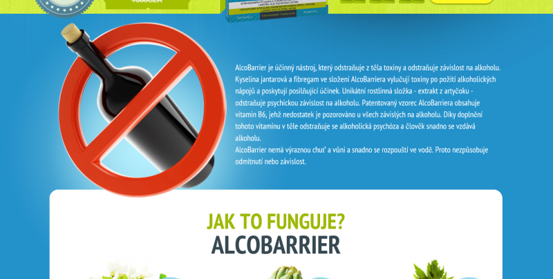 Stránky http://cz.thealcobarrier.com jsou v českém jazyce. Nabízený produkt je možné koupit za české koruny. Na stránkách je nabízen přípravek proti alkoholismu AlcoBarrier.
