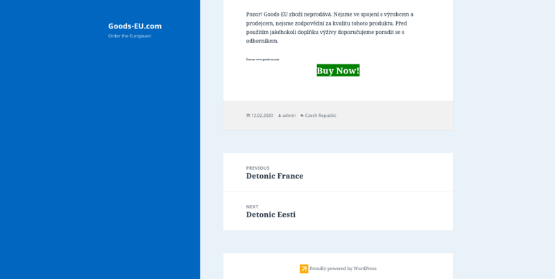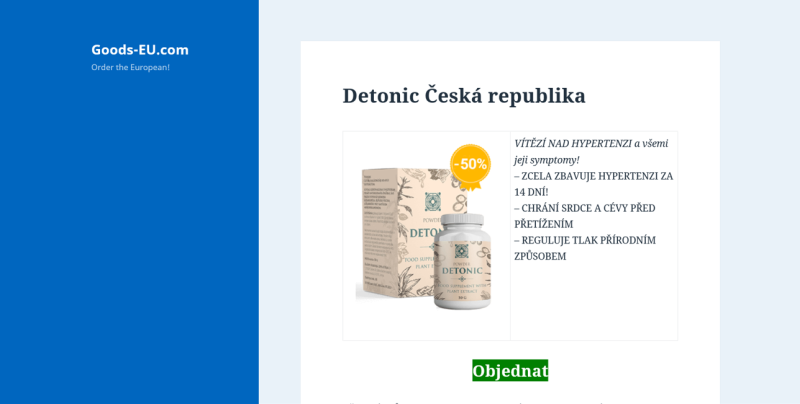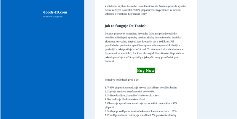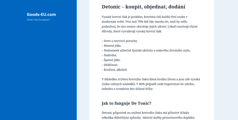 Webová stránka je v českém jazyce. Jedná se o reklamní webovou stránku, kde je prezentován výrobek Detonic, který je používán jako přípravek na snížení krevního tlaku.