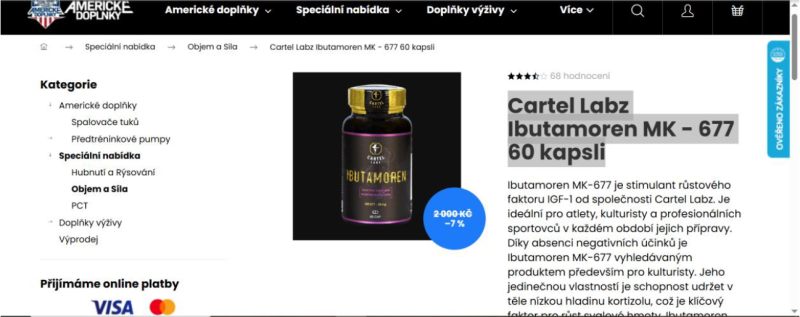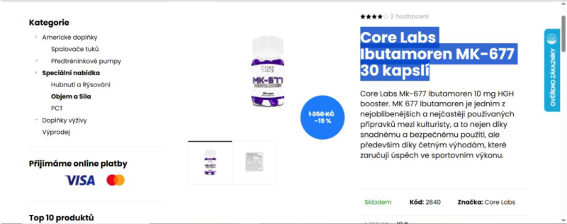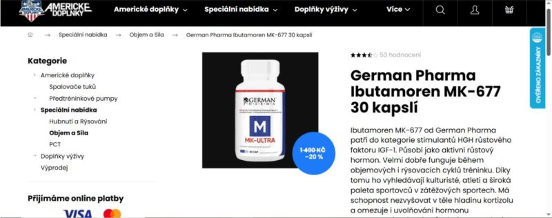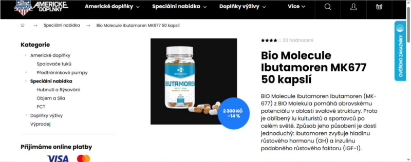 1) Kontrolou bylo zjištěno a prokázáno, že na těchto internetových stránkách je nabízena k prodeji potravina obsahující látku s hormonálním účinkem. Jedná se konkrétně o potravinu „Swiss Pharmaceuticals IBUTAMOREN MK-677 45 kapslí“ s deklarovaným obsahem ibutamorenu, což je látka s hormonálním účinkem a nesmí být přítomna v potravinách. Dále bylo zjištěno a prokázáno, že je zde nabízena nebezpečná potravina a to „Dark Labs Herolean 153 g“ s deklarovaným obsahem yohimbinu a která byla hodnocena jako nebezpečná potravina dle čl. 14 nařízení (ES) č. 178/2002 a nesmí být tedy uváděna na trh. Použití přípravků pocházejících z kůry bujarníku johimbe (Pausinystalia johimbe) je dle nařízení (ES) č. 1925/2006 zakázáno. Konzumace potraviny s obsahem yohimbinu může vést k poškození zdraví.
